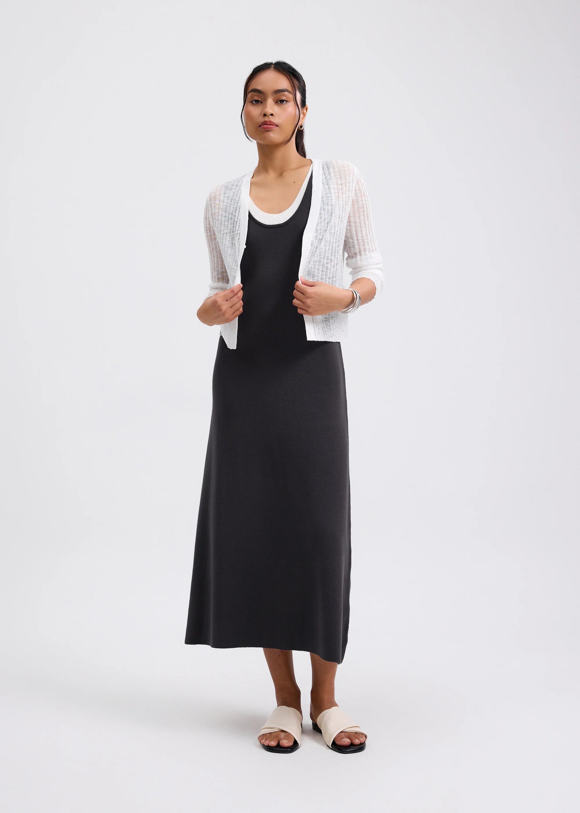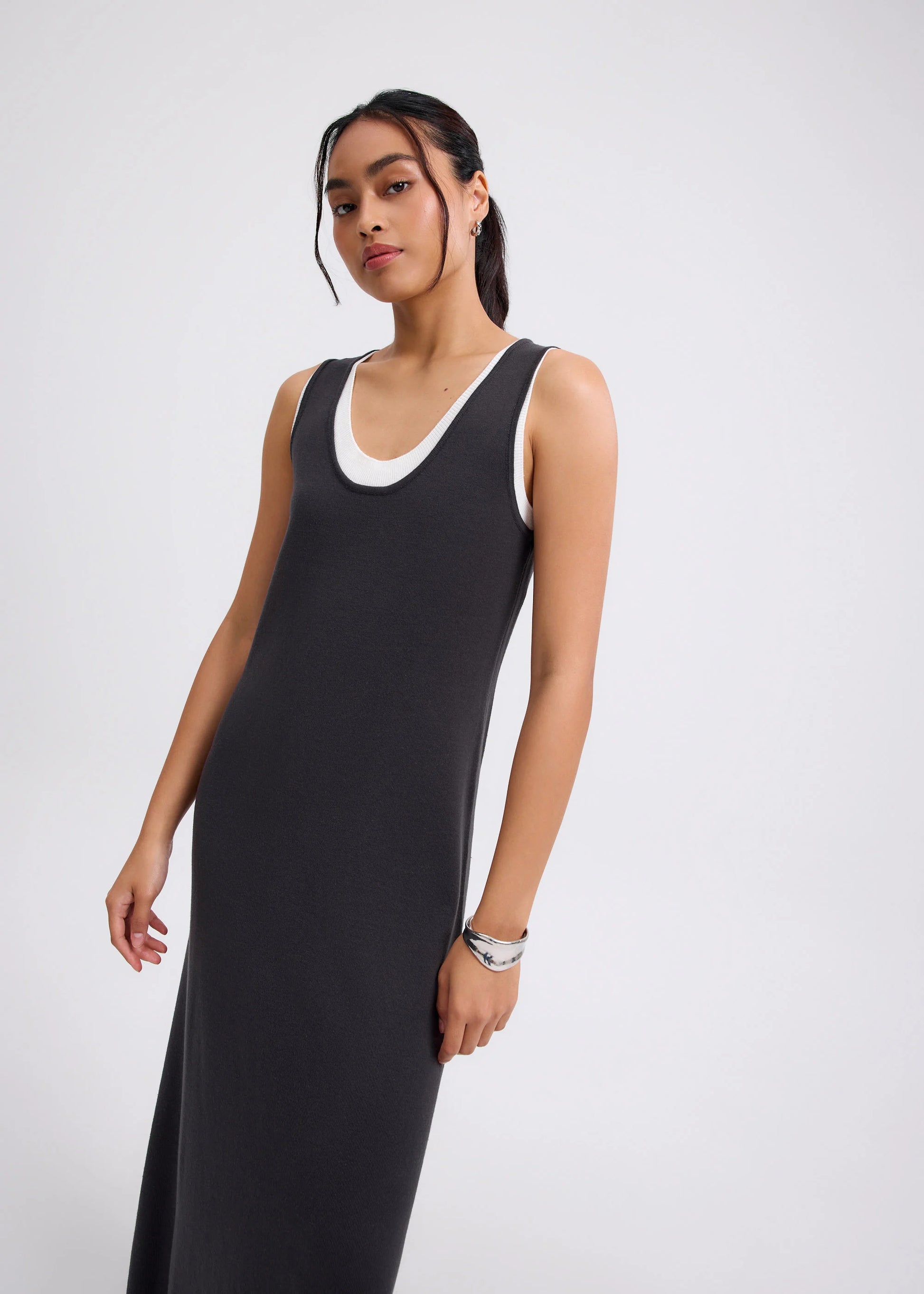 Introducing your cheat code to layering. A midaxi dress made of soft knit with a double-layered scoop neck for your put-on-and-go kind of days. Wear her when you want to look more put-together than your life or when your layers don't agree with the weather. Don't worry, the A-line silhouette and faux layers give you an effortlessly chic look without sacrificing comfort.