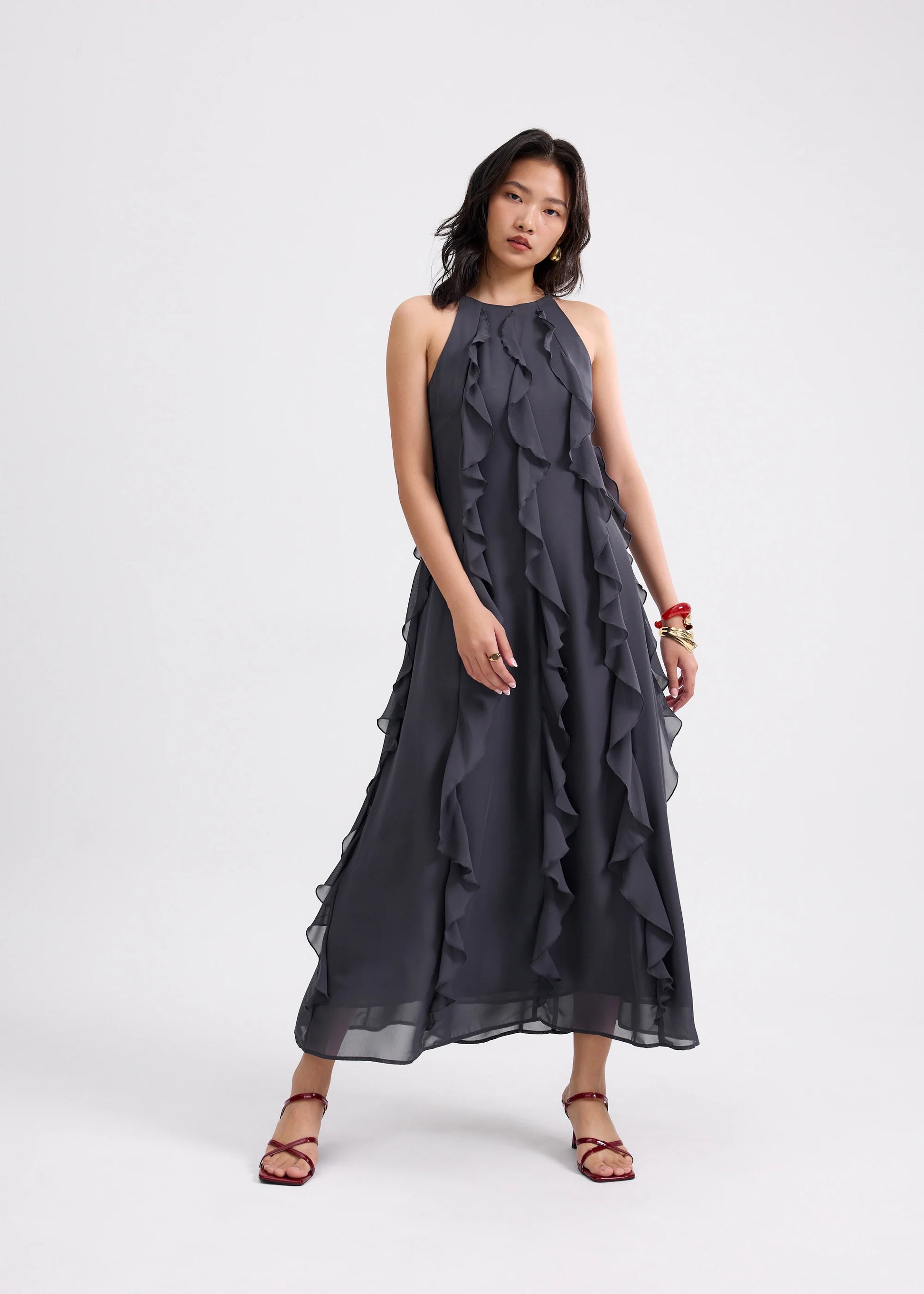 Comfy, classy, and crease-resistant—what more could you ask for? Crafted from lightweight georgette, this beauty is adorned with frills that go from neck to maxi hem for that dreamy vibe. Combined with a halter neck and billowy silhouette, you're sure to look good as you feel when you have it on. She's your go-to for both casual dates and special occasions for that effortless feminine touch. Finished with full lining.