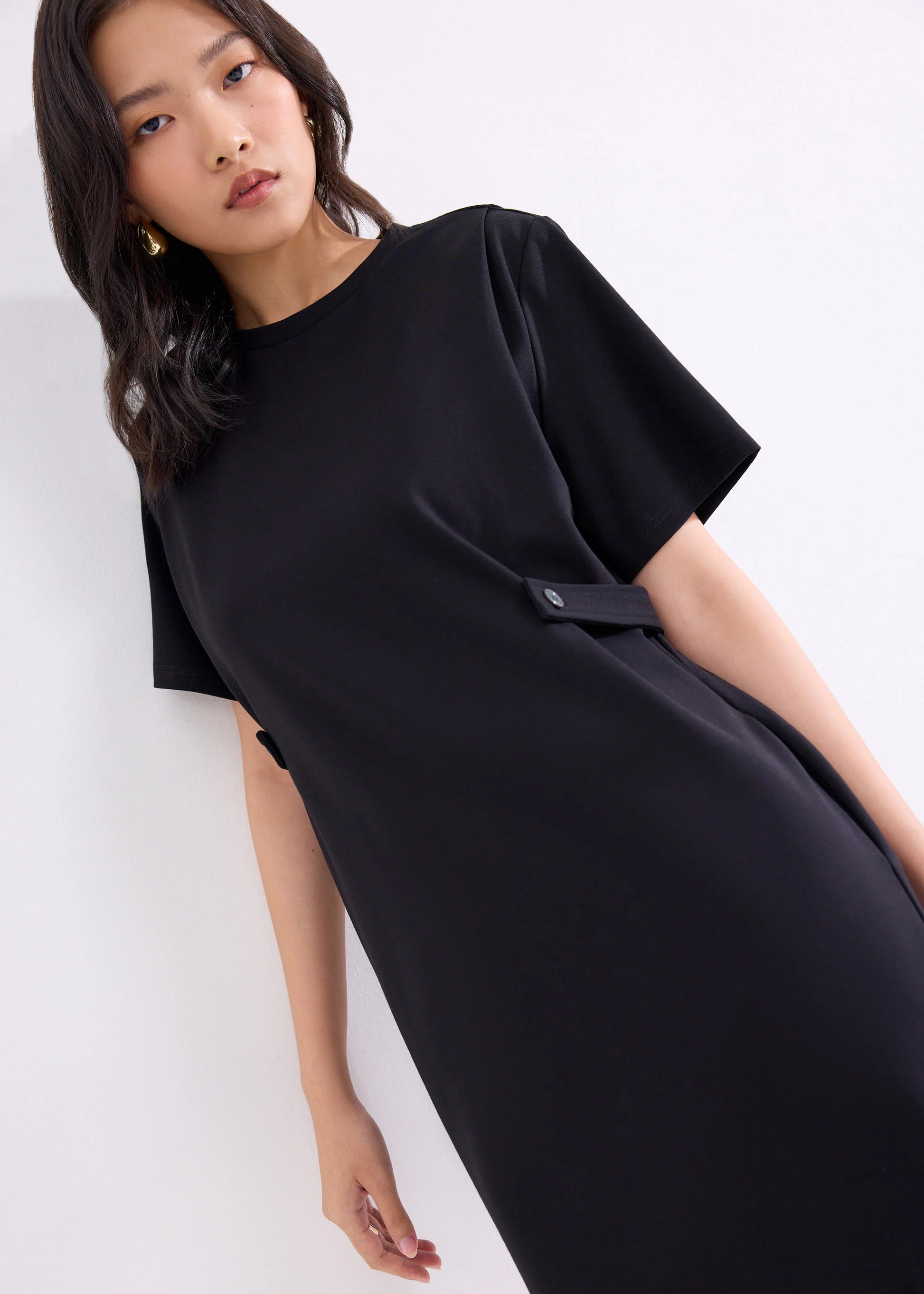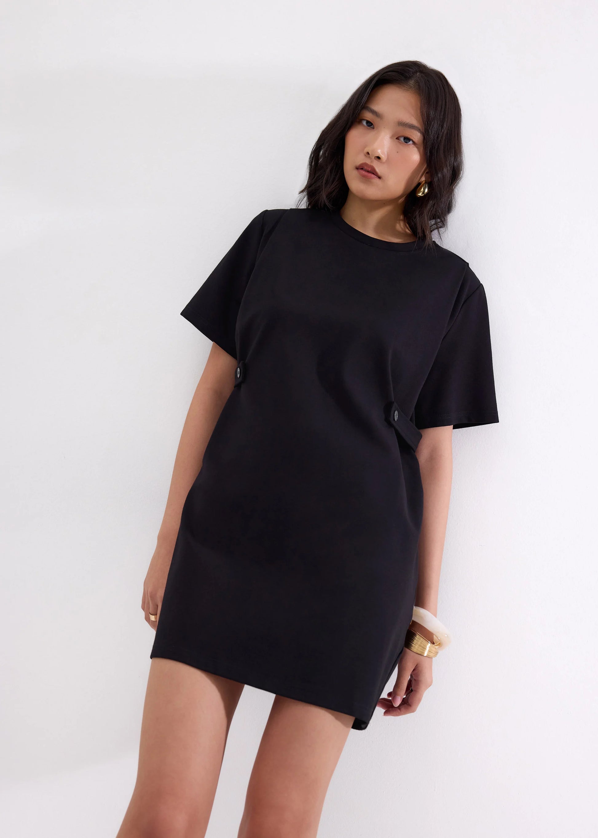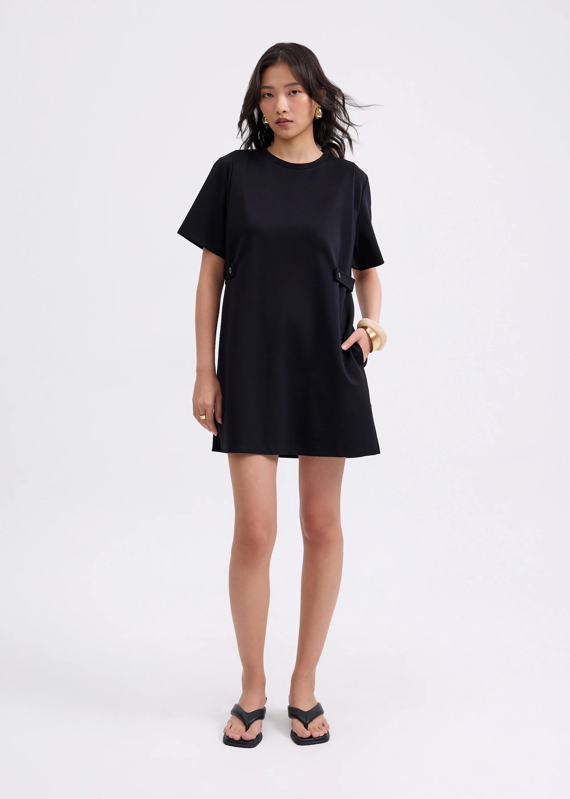 When you want something simple yet put-together, she's your girl. With her classic A-line silhouette, round neck, and button strap details on the sides, looking chic is as simple as throwing her on. This mini dress also offers extra comfort and utility through its stretch fabric and functional side pockets that fit your essentials. Whether its going to the office or hanging out on the weekends, you know she can fit right in.