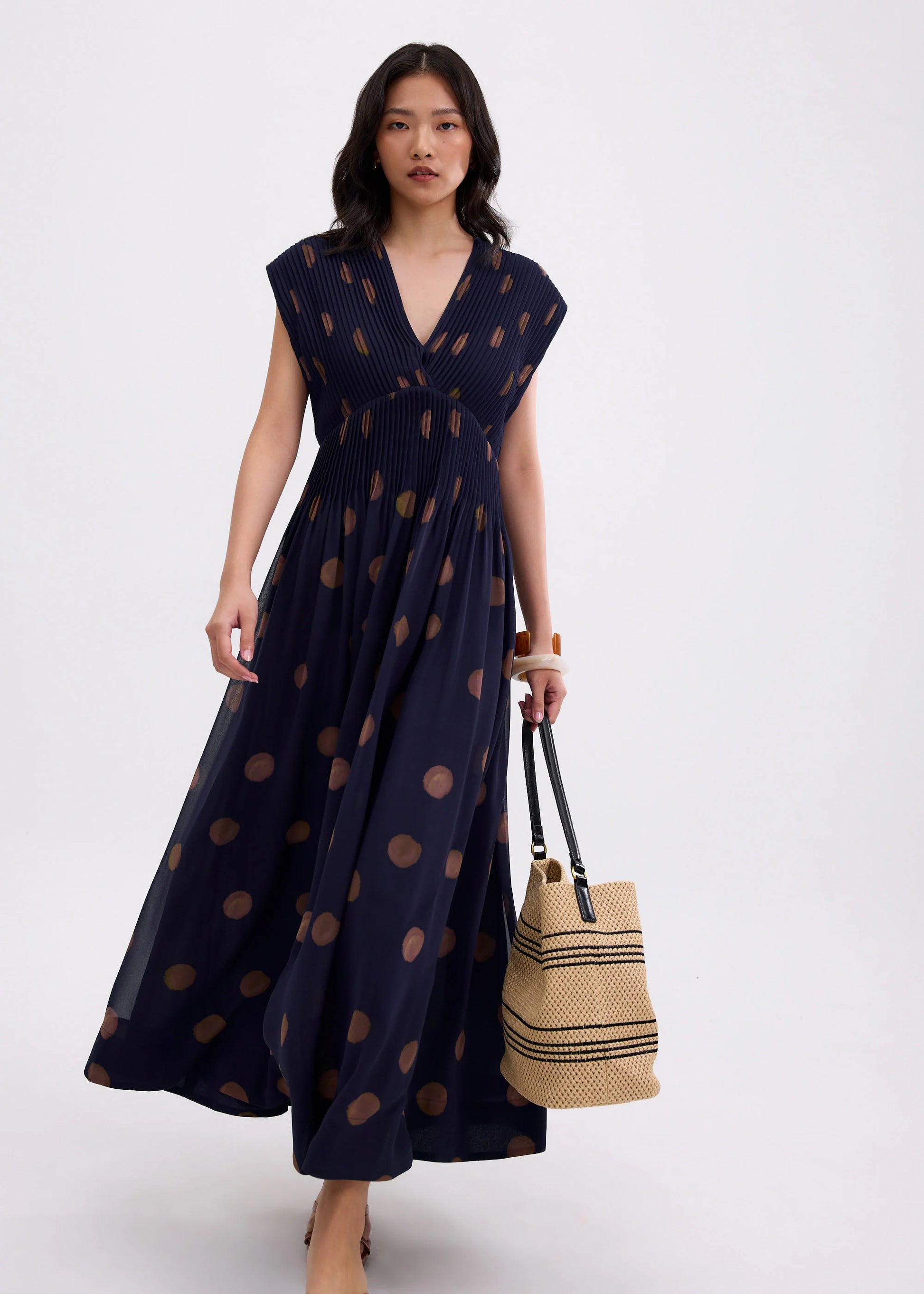 Specially designed in-house print. No time to talk? Let the whimsical prints speak for themselves. Taking notes from our Padded Plunge Fit & Flare Maxi Dress, this maxi dress in plisse has the same features but in a custom polka-dot print that steals the scene. The beloved fit and flare silhouette accentuates your waist while giving you enough room to breathe, walk, and have seconds at the buffet. Finished with cap sleeves and a plunging neckline with a back ribbon tie for support. Comes fully lined with a back zipper.